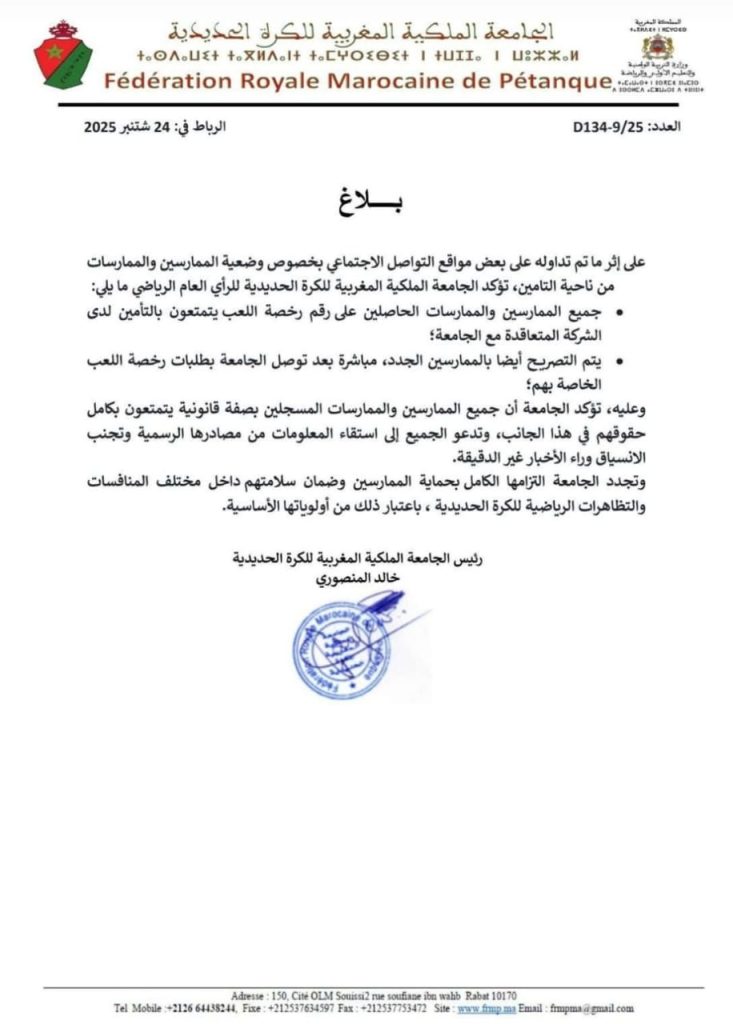 الجامعة الملكية المغربية للكرة الحديدية أصدرت بتاريخ 24 شتنبر 2025 بلاغا رسميا ردا على ما تم تداوله في مواقع التواصل الاجتماعي بخصوص وضعية التأمين بالنسبة للممارسين واللاعبين.