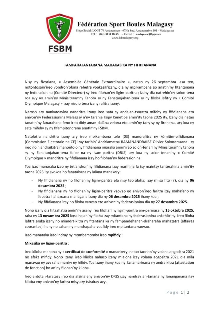 Alors que la Fédération Royale Marocaine de Pétanque (FRMP) n’a toujours pas tenu ses trois Assemblées Générales statutaires — deux ordinaires et une élective — 2022-2023, 2023-2024 et 2024-2025 en dépit des délais largement dépassés, la Fédération Sport Boules Malgache (FSBM) vient d’annoncer avec rigueur et transparence son calendrier électoral 2025, confirmant une fois de plus son sérieux institutionnel.