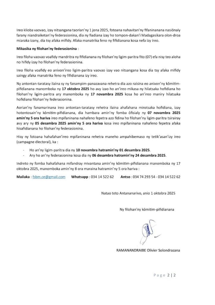 Le 1er octobre 2025, la FSBM a publié un communiqué officiel détaillant l’ensemble du processus électoral :
