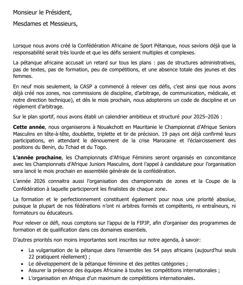 Lors de la réunion du Comité Exécutif de la Fédération Internationale de Pétanque et de Jeu Provençal (FIPJP) du 08 octobre 2025 , le vice-président de la Confédération Africaine du Sport de Pétanque (CASP), M. Mohamed Lemine Louly, a livré un discours fort et structuré retraçant les avancées notables de la pétanque africaine depuis la création de la CASP.