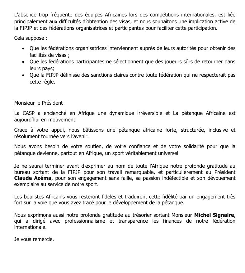Son discours, empreint d’optimisme et de reconnaissance, a traduit la volonté de la CASP de faire de la pétanque africaine un acteur structuré, dynamique et pleinement intégré au mouvement international.