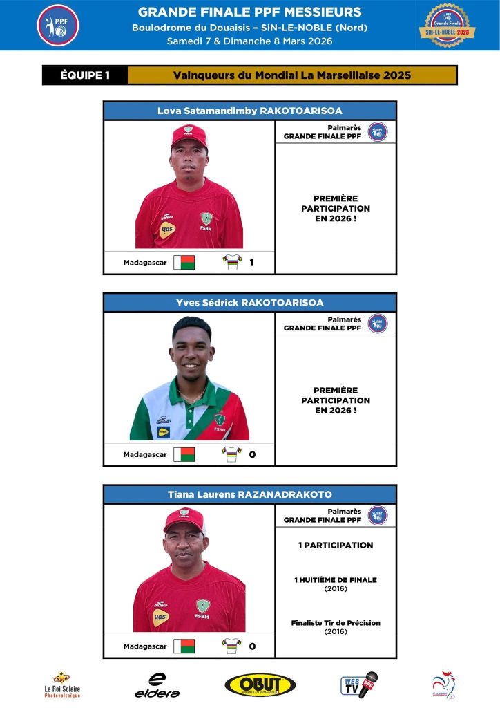 les vainqueurs du Mondial La Marseillaise à pétanque 2025, la triplette malgache composée de Lova Rakotoarisoa, Yves Rakotoarisoa et Tiana Razanadrakoto, seront automatiquement qualifiés et présents à la Grande Finale PPF 2026.