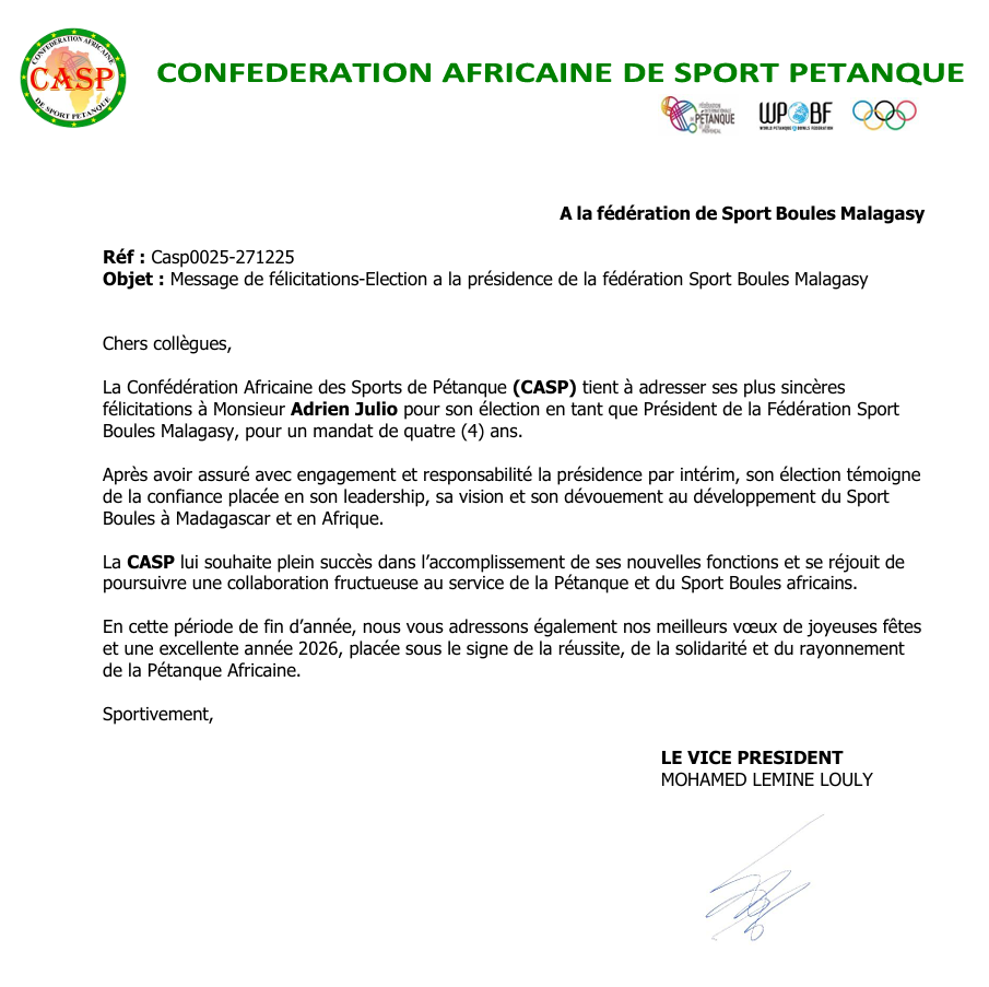À la suite de cette élection, la Confédération Africaine des Sports de Pétanque (CASP) a adressé à la Fédération Sport Boules Malagasy une lettre officielle de félicitations, saluant l’élection de M. Adrien Julio et la confiance placée en son leadership.
