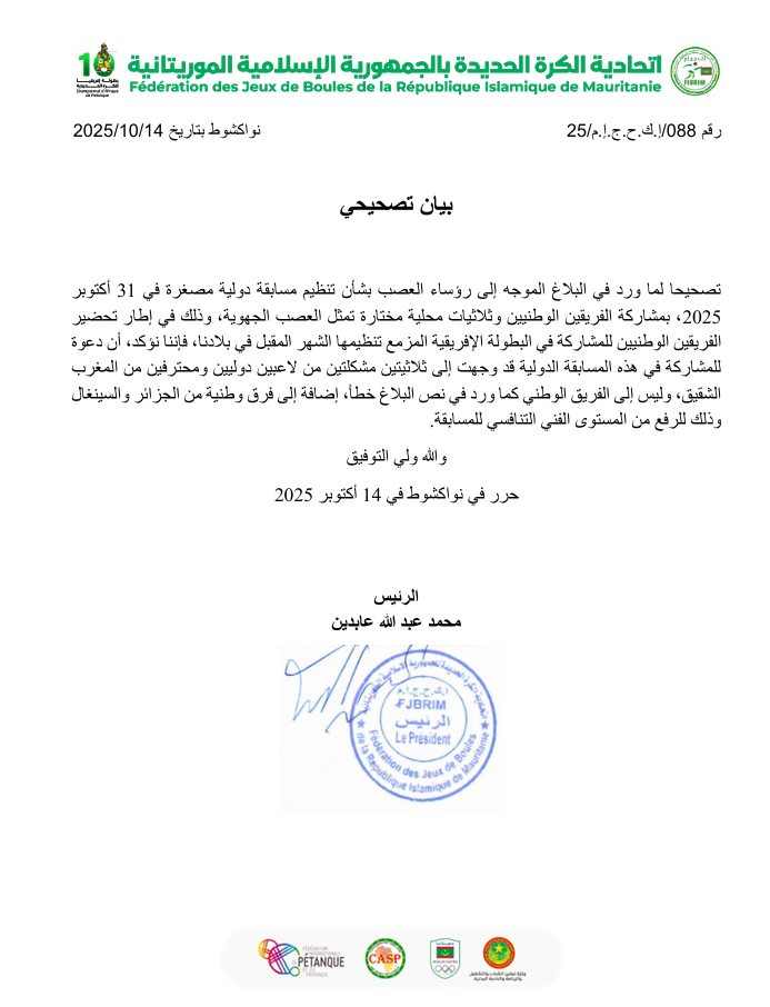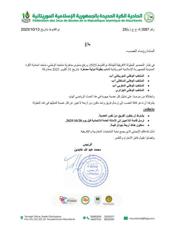 Une confusion est née à la suite du communiqué publié le 13 octobre 2025 par la Fédération des Jeux de Boules de la République Islamique de Mauritanie (FJBRIM), annonçant la participation de deux équipes nationales marocaines à une compétition à Nouakchott.