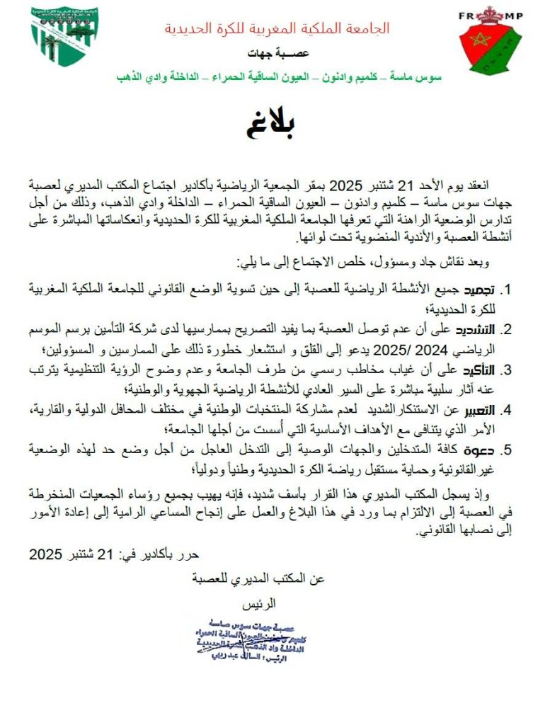 À peine quelques jours après la décision fracassante de la Ligue Marrakech–Safi de geler toutes ses activités pétanque, c’est désormais la Ligue Souss–Massa – Guelmim Oued Noun – Laâyoune Sakia El Hamra – Dakhla Oued Eddahab qui emboîte le pas. Réunie en urgence le 21 septembre 2025 à Agadir, son bureau directeur a annoncé la suspension immédiate de toutes les compétitions et activités pétanque dans son ressort territorial, tant que la Fédération Royale Marocaine de Pétanque (FRMP) ne régularisera pas sa situation légale et organisationnelle.